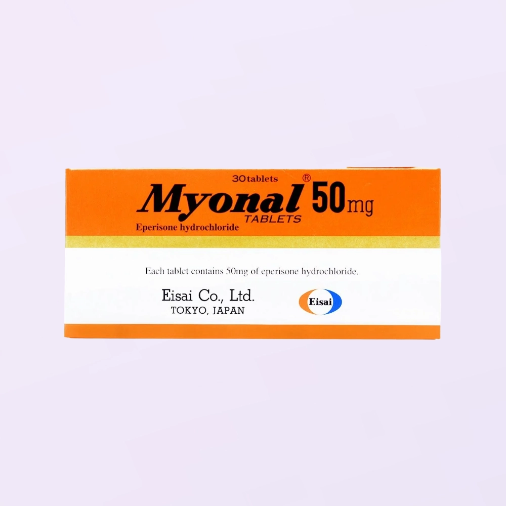 Myonal (active ingredient: Eperisone Hydrochloride) is a muscle relaxant used to relieve muscle stiffness, spasm, and pain associated with conditions such as cervical spondylosis, low back pain, and post-operative muscle tension. It works by improving blood flow and reducing abnormal muscle contraction.
